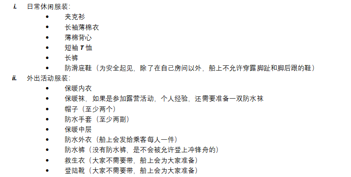 6.摄影器材准备i.个人所需药物,包括晕船药(晕船药船上也会有发放)ii.拖鞋(房间内使用)iii.其他内衣物iv.洗漱护肤用品(洗发水、护发素、浴液都不用带,船上给大家准备的都是欧舒丹的,润唇膏一定别忘了,南极是世界上最干的大洲,白色沙漠)v.面膜vi.隐形眼镜vii.手机、充电器等电子用品viii.书,尤其是跟南极动物有关的书,方便辨认所看到的动物(船上也有卖的)ix.手提电脑x.转换插头,如果充电设备多的朋友,还需要准备接线板xi.防滑垫(elephant skin)xii.行李箱尽量不要带硬壳箱,船上空间小,软箱子方便收藏到床下xiii.不用准备食物,除非你有特殊口味需求,船上吃得极好,就等着长肉肉吧
