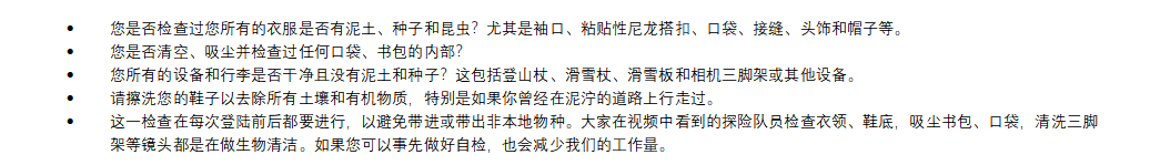 游客可能会不小心将外来种子、害虫或疾病(统称为非本地物种)带入南极洲或在不同的南极生态系统之间转移。 没有确凿的证据表明游客将外来物种带入南极野生动物或将疾病传播给南极野生动物,但有一些间接和间接证据引起关注。为了尽量减少将非本地物种带入南极洲的机会,IAATO 推荐了一系列检查及清洁措施,自检清单包括: