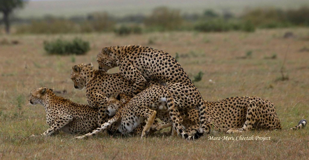 在它们懵懂的青年时代,交配毫无章法。比如,2017年12月19日,当四弟 – 奥拉里沙尼遇到草原美女诺拉(Nora),与其交配时被其他三只兄弟发现,蜂拥而上,就发生了四只猎豹骑在一只母豹身上的滑稽一幕(下图来自于Mara-Meru猎豹保护项目)。