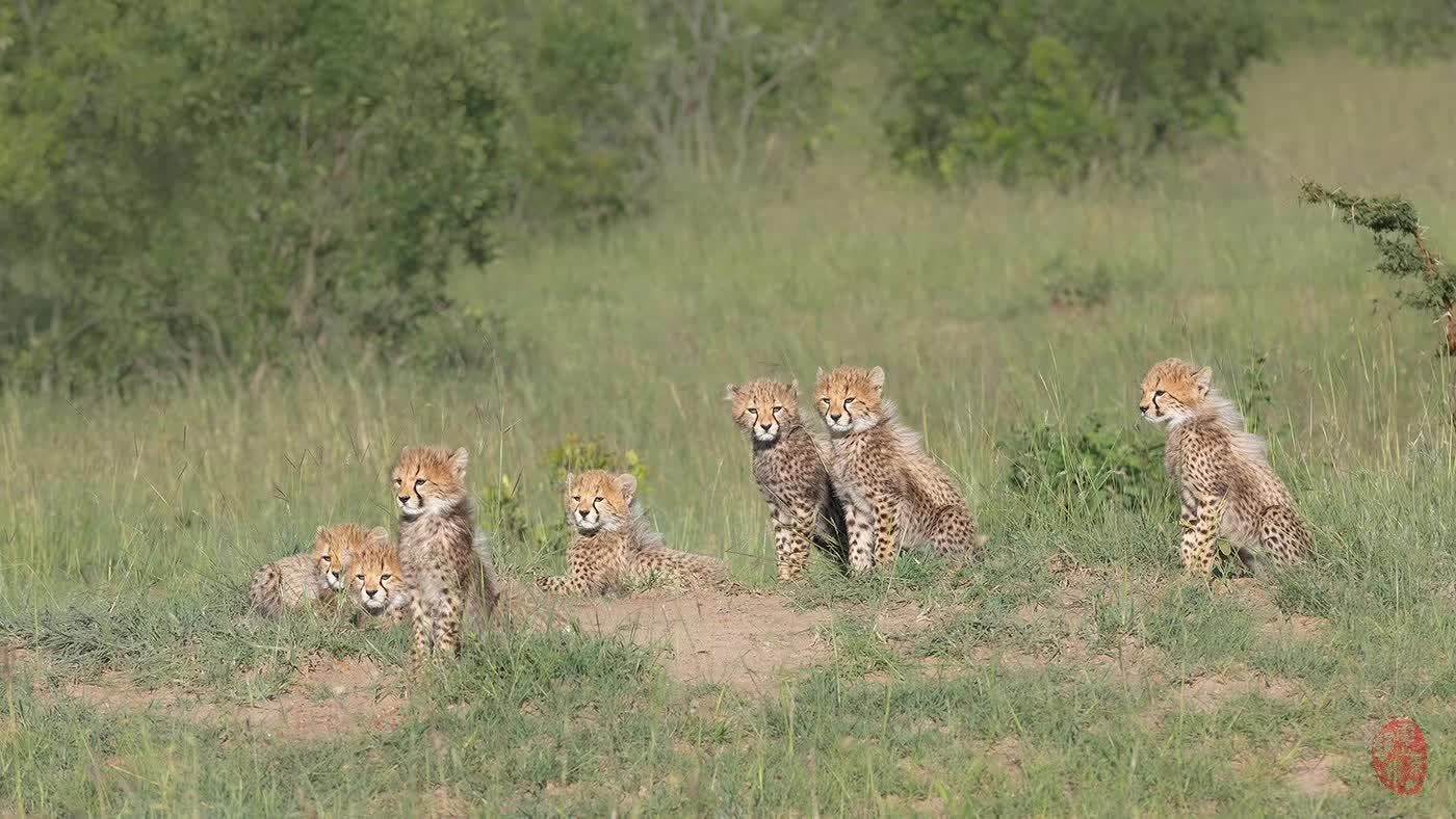 俗话说猫三狗四,指的是猫的孕期是三个月,狗的孕期是四个月。猫三个月生崽不仅仅说的是家养的小猫,就连野外的大猫们也是如此。猎豹交配后,公豹就会离去,继续在草原上逍遥快活,留下母豹独自照顾自己度过孕期。大概90多天,母豹就会找一处既隐蔽又安全的比较熟悉的地方生产。猎豹一窝可以生产3-5只,马赛马拉的最高记录是五兄弟之一,奥尔帕丹 (Olpadan) 的姐妹西利吉 (Siligi) 在2019年创造的,一窝生下来7只小猎豹。很可惜,7只小猎豹无一长大,幸运的是,我在它们三个月左右大的时候拍到了7只小猎豹同框等妈妈捕猎归来的镜头。