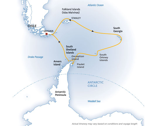 由乌斯怀亚出发前往南极大陆,通常可以选择8-9天的经典行程,或者9-12天的穿越南极圈之旅,穿圈之旅会比经典行程更多2-3天的游玩时间。